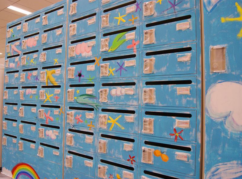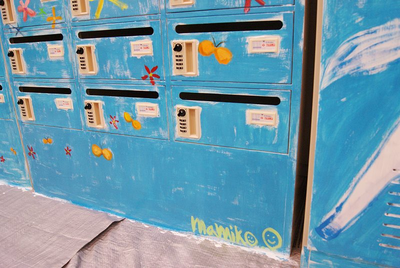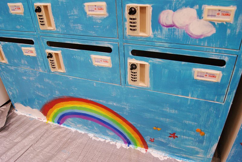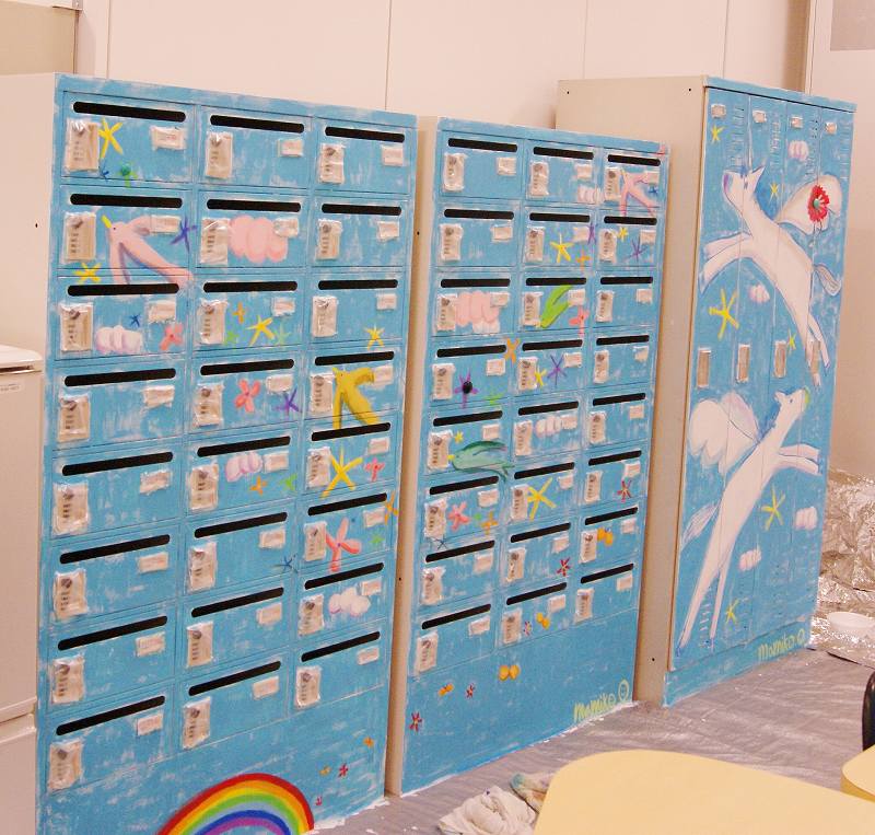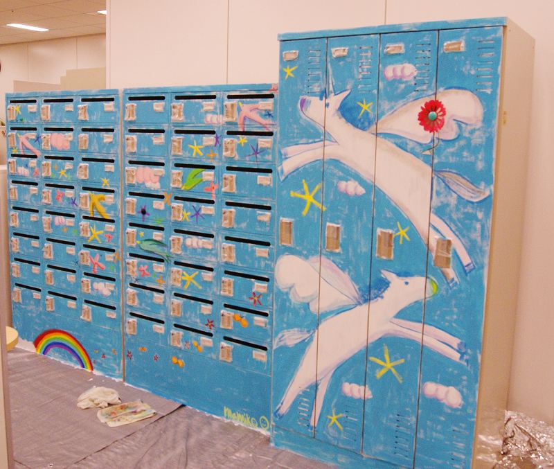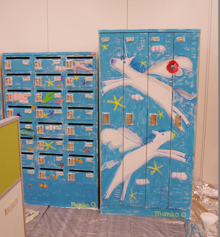 そして後日、オフィスのお休みの日を利用して、メールボックスとロッカー、計3台にまたがる大きな絵を描きました。