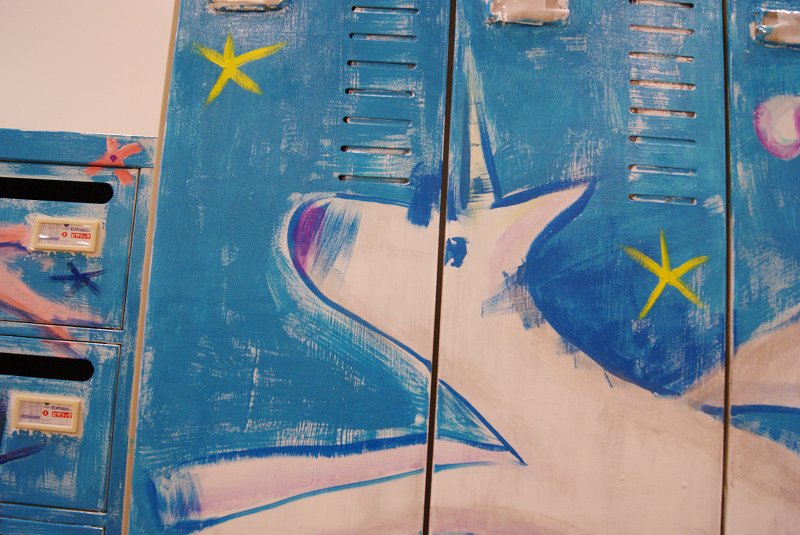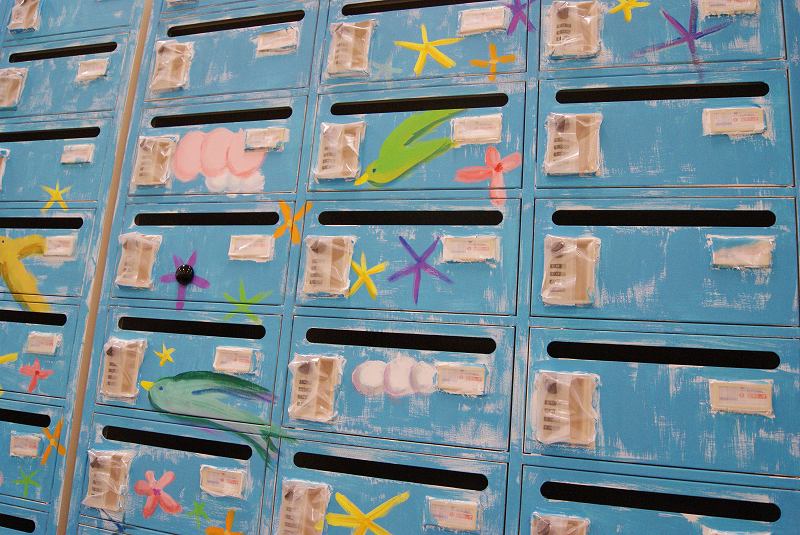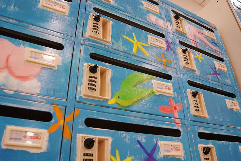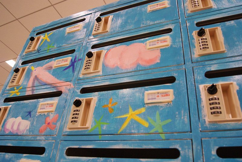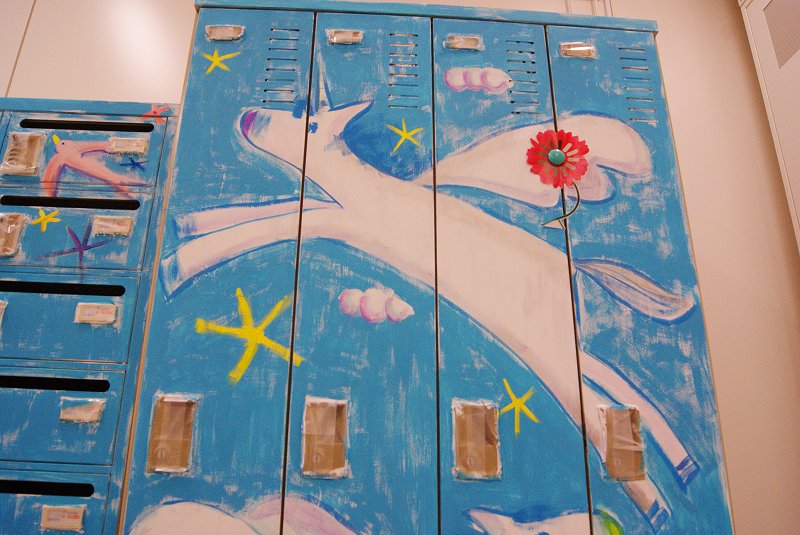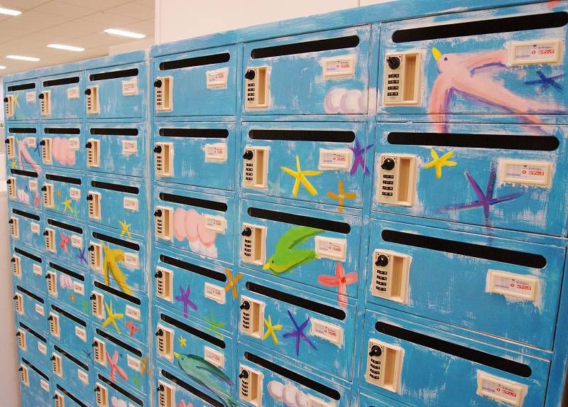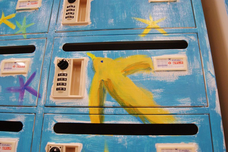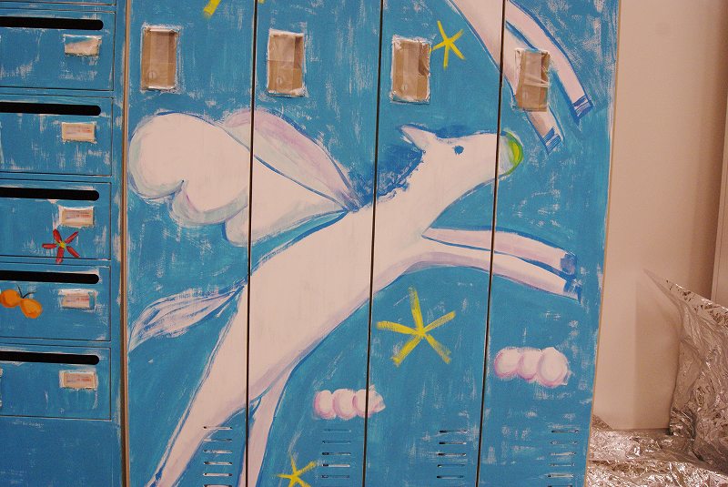 そして後日、オフィスのお休みの日を利用して、メールボックスとロッカー、計3台にまたがる大きな絵を描きました。