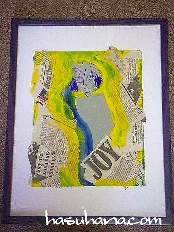 ちょっと写真では色が変な感じですが、額縁は鮮やかな黄色で、背景の水色ととてもいいバランスを保っていて、とっても明るい感じです。