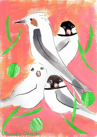 いきものリクエスト!第9弾は、「ヒヨドリ1羽、白文鳥1羽、桜文鳥2羽」の絵です。