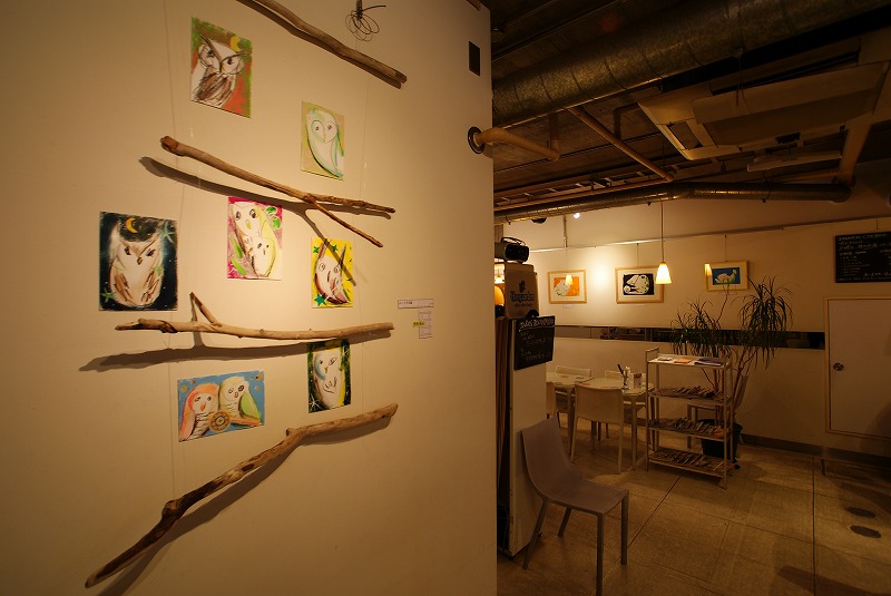 そして奥のソファー席の壁には、流木のモビールと、ふくろうの小作品を展示しています。
