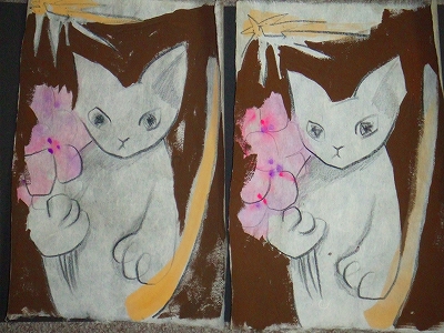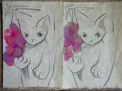 以前描いた猫が花束を持っている作品を、というリクエストだったので、それを描かせていただいたんだけど、前にも言ったように、私はほとんど感覚で描いてるので、最初はまたこの絵が描けるかどうか、すごく不安でした。